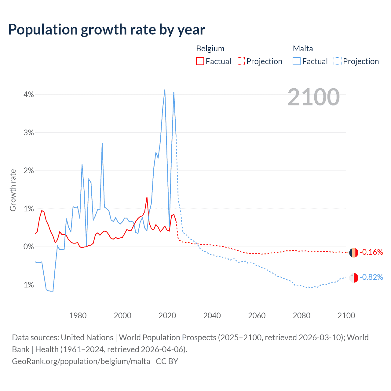 - For the last 10 years, Belgium has had an average growth rate of +0.55% per year vs +2.69% in Malta.