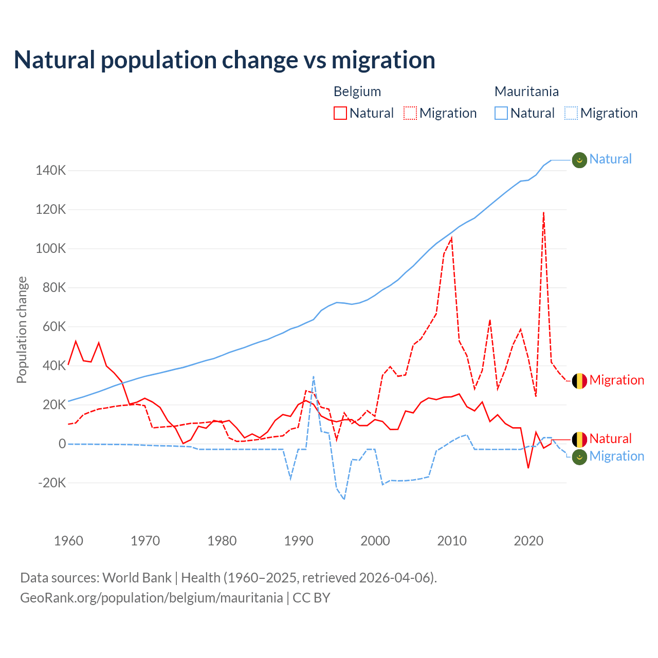 Over the last 10 years, 11.3% of the population change in Belgium is from natural causes (a gain of 64,346 people) and 88.7% is from migration (a gain of 504,240 people). In Mauritania 98.9% is from natural causes (a gain of 1,320,903 people) and 1.12% is from migration (a loss of 14,982 people).