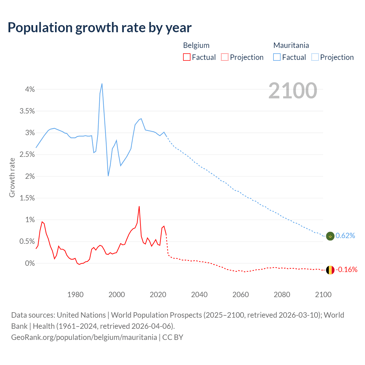 - For the last 10 years, Belgium has had an average growth rate of +0.55% per year vs +3% in Mauritania.