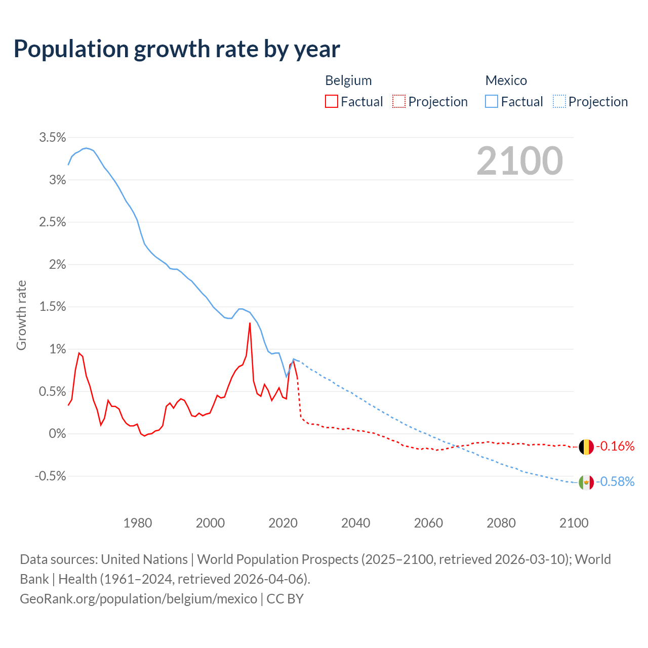 - For the last 10 years, Belgium has had an average growth rate of +0.55% per year vs +0.92% in Mexico.