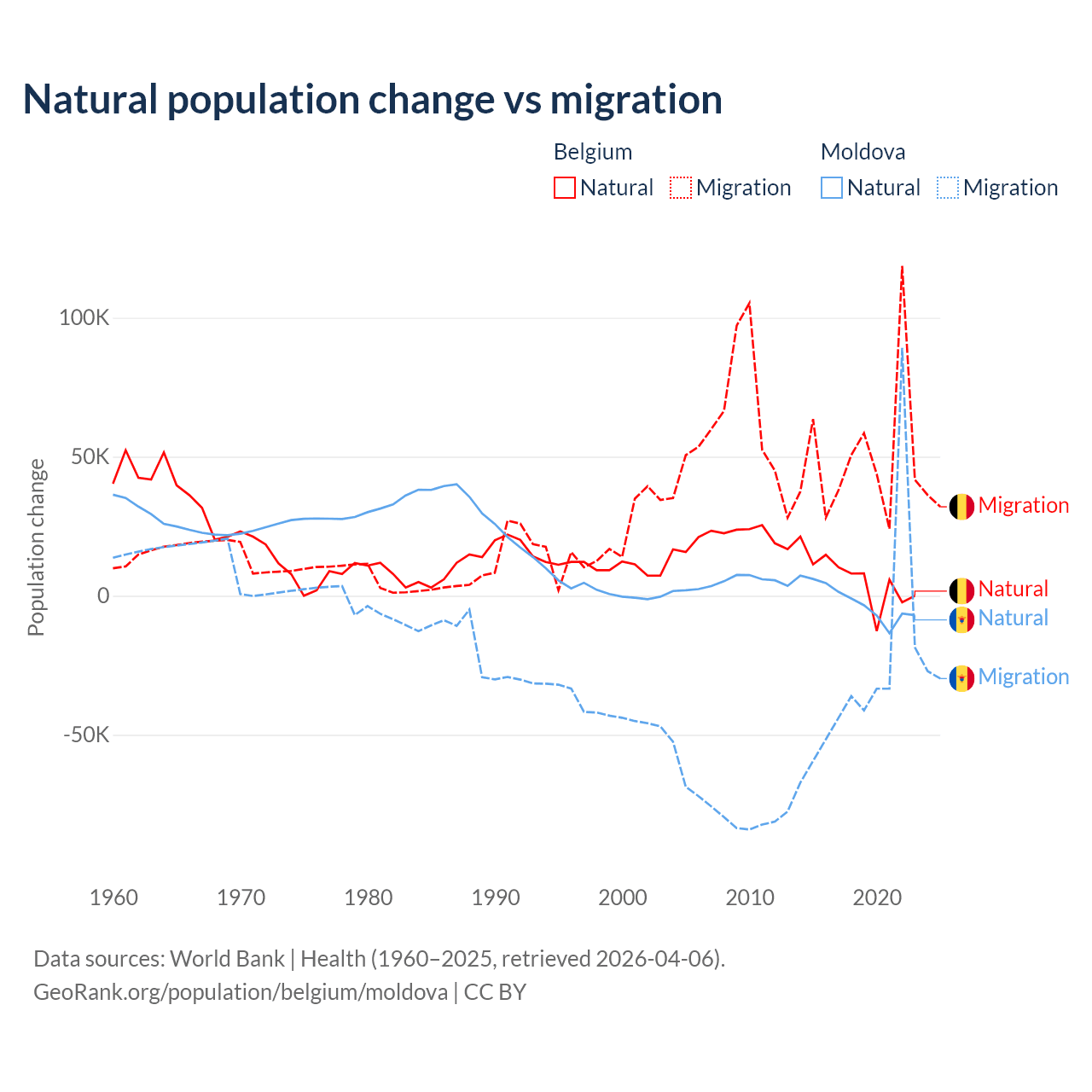 Over the last 10 years, 11.3% of the population change in Belgium is from natural causes (a gain of 64,346 people) and 88.7% is from migration (a gain of 504,240 people). In Moldova 6.04% is from natural causes (a loss of 19,001 people) and 94% is from migration (a loss of 295,631 people).