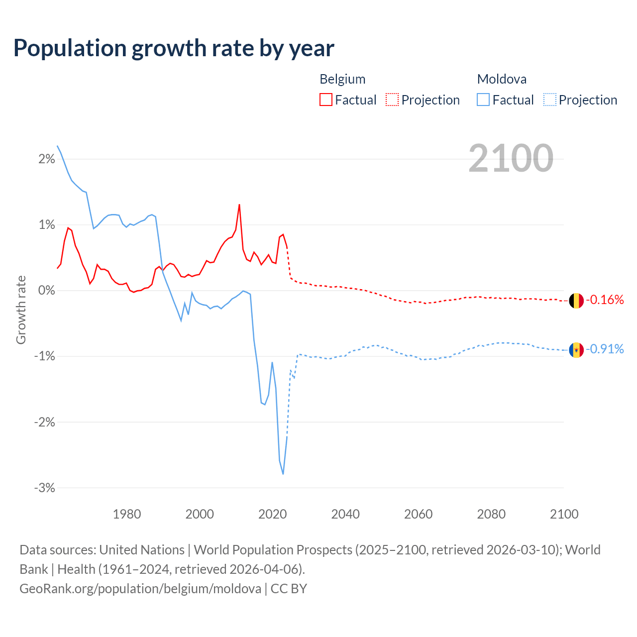 - For the last 10 years, Belgium has had an average growth rate of +0.55% per year vs -1.57% in Moldova.