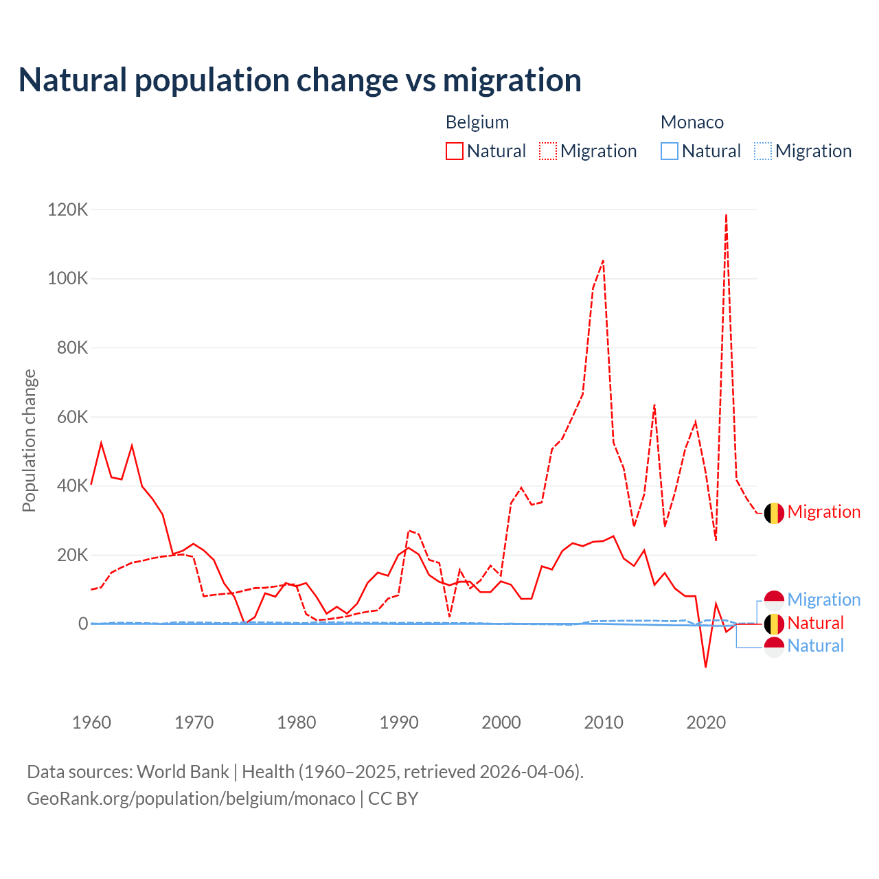 Over the last 10 years, 11.3% of the population change in Belgium is from natural causes (a gain of 64,346 people) and 88.7% is from migration (a gain of 504,240 people). In Monaco 37.3% is from natural causes (a loss of 4,357 people) and 62.7% is from migration (a gain of 7,333 people).