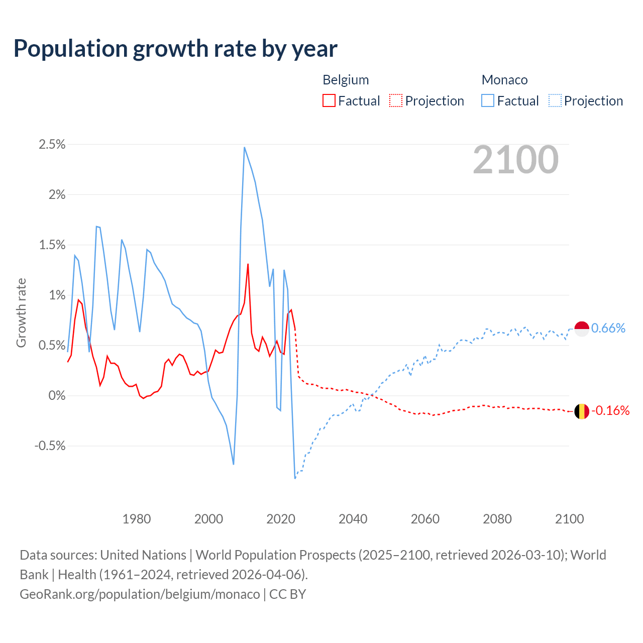 - For the last 10 years, Belgium has had an average growth rate of +0.55% per year vs +0.79% in Monaco.