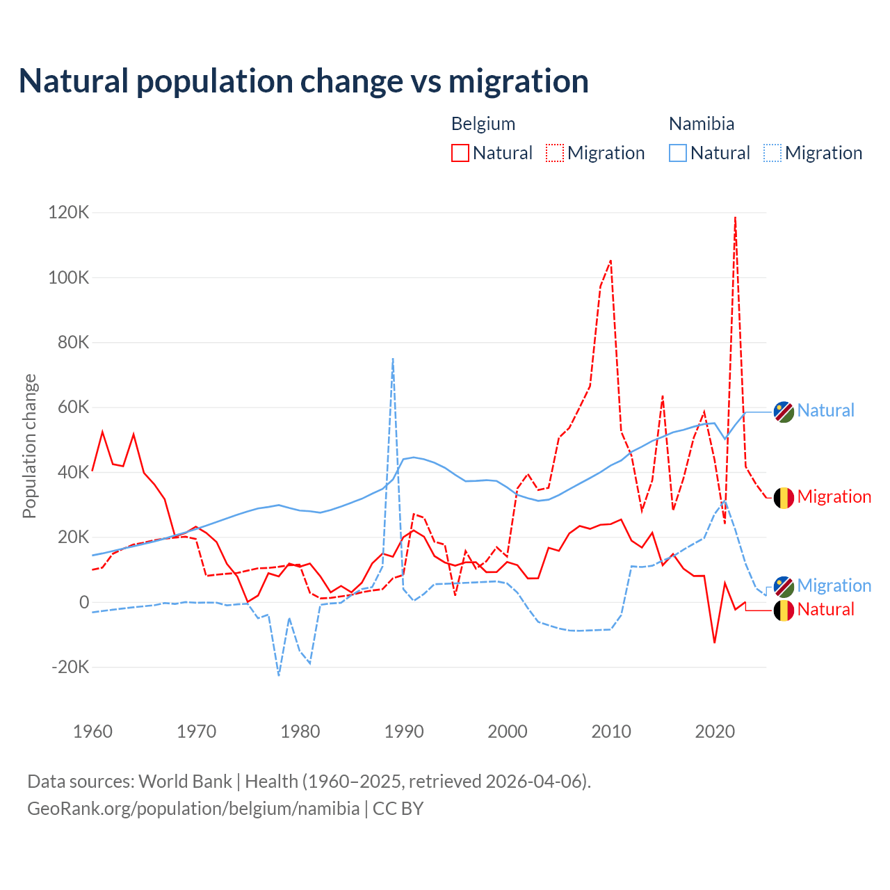 Over the last 10 years, 11.3% of the population change in Belgium is from natural causes (a gain of 64,346 people) and 88.7% is from migration (a gain of 504,240 people). In Namibia 74.3% is from natural causes (a gain of 532,532 people) and 25.7% is from migration (a gain of 183,837 people).