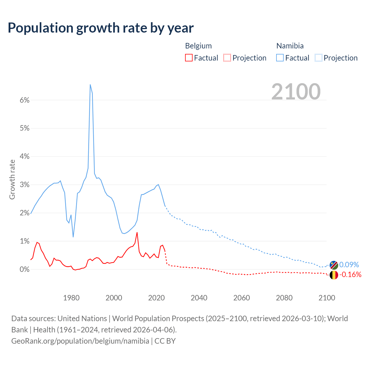 - For the last 10 years, Belgium has had an average growth rate of +0.55% per year vs +2.73% in Namibia.