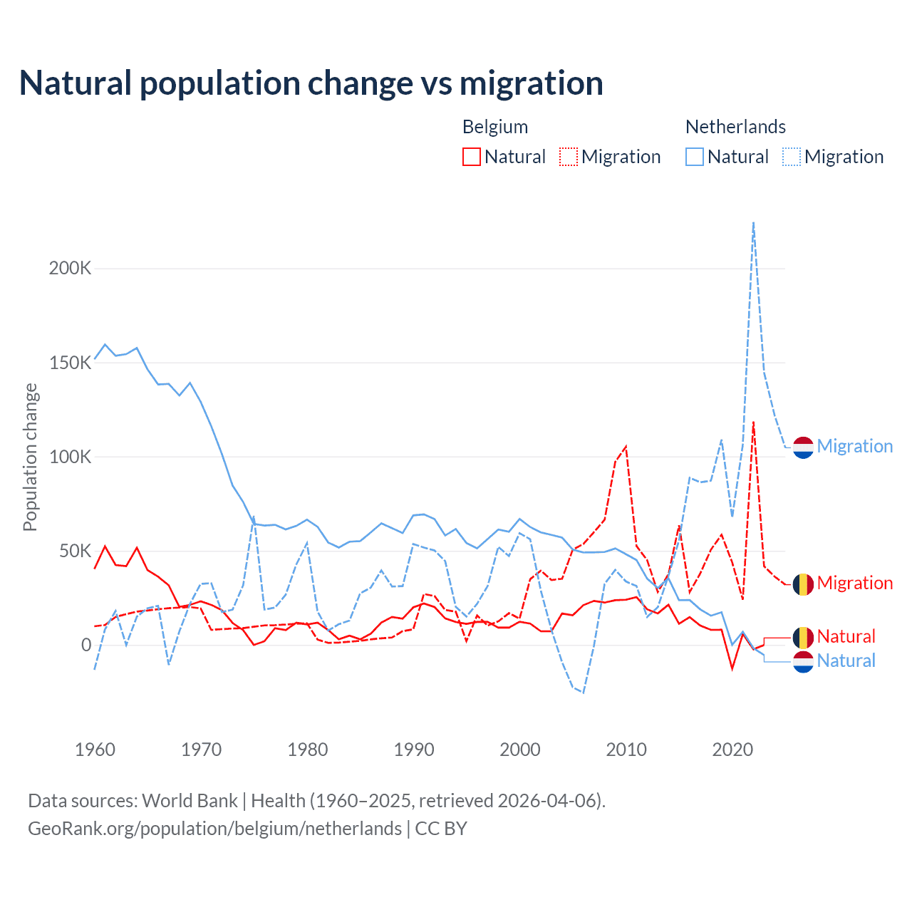 Over the last 10 years, 11.3% of the population change in Belgium is from natural causes (a gain of 64,346 people) and 88.7% is from migration (a gain of 504,240 people). In the Netherlands 11.8% is from natural causes (a gain of 134,554 people) and 88.2% is from migration (a gain of 1,006,495 people).
