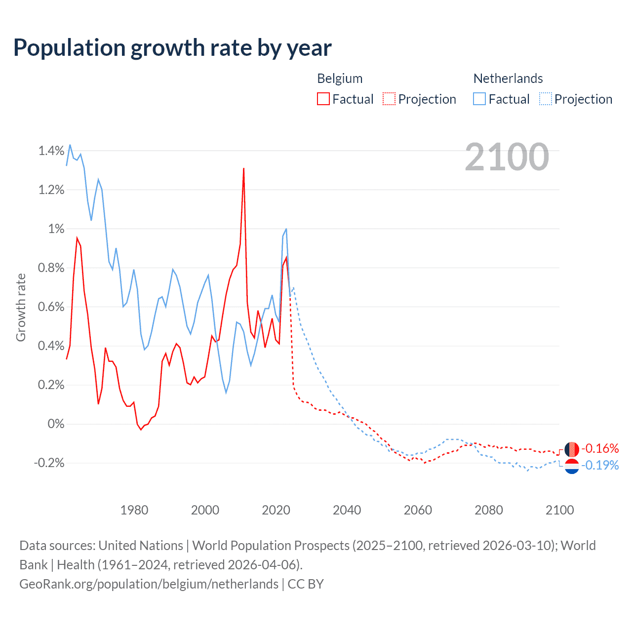 - For the last 10 years, Belgium has had an average growth rate of +0.55% per year vs +0.62% in the Netherlands.