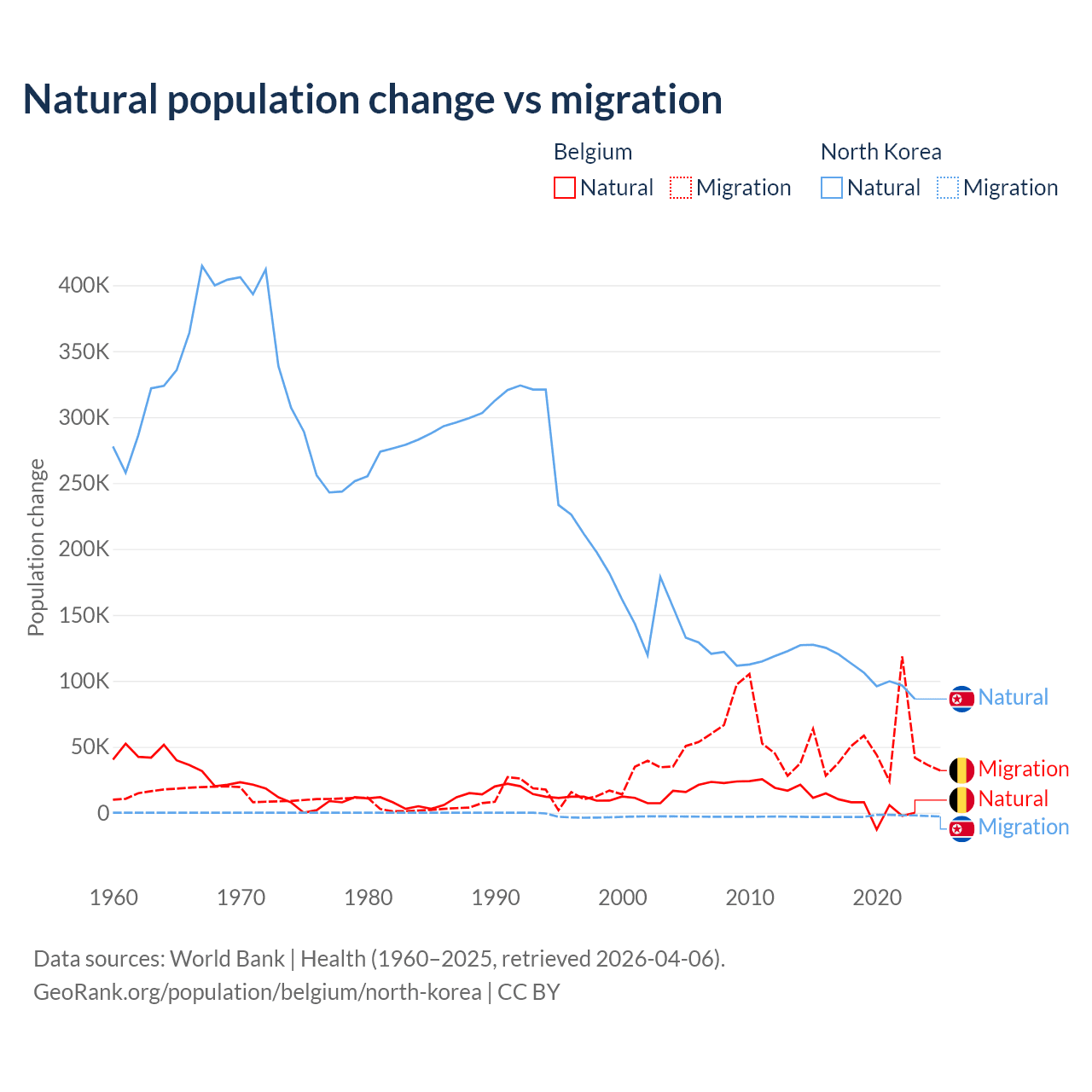 Over the last 10 years, 11.3% of the population change in Belgium is from natural causes (a gain of 64,346 people) and 88.7% is from migration (a gain of 504,240 people). In North Korea 97.7% is from natural causes (a gain of 1,097,372 people) and 2.33% is from migration (a loss of 26,227 people).