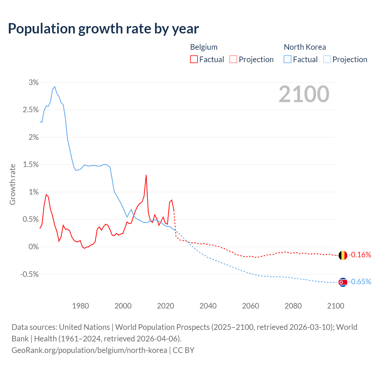 - For the last 10 years, Belgium has had an average growth rate of +0.55% per year vs +0.41% in North Korea.