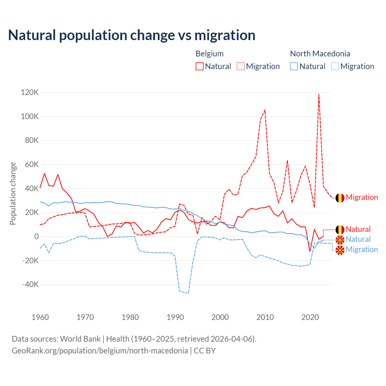 Over the last 10 years, 11.3% of the population change in Belgium is from natural causes (a gain of 64,346 people) and 88.7% is from migration (a gain of 504,240 people). In North Macedonia 6.45% is from natural causes (a loss of 12,585 people) and 93.5% is from migration (a loss of 182,429 people).