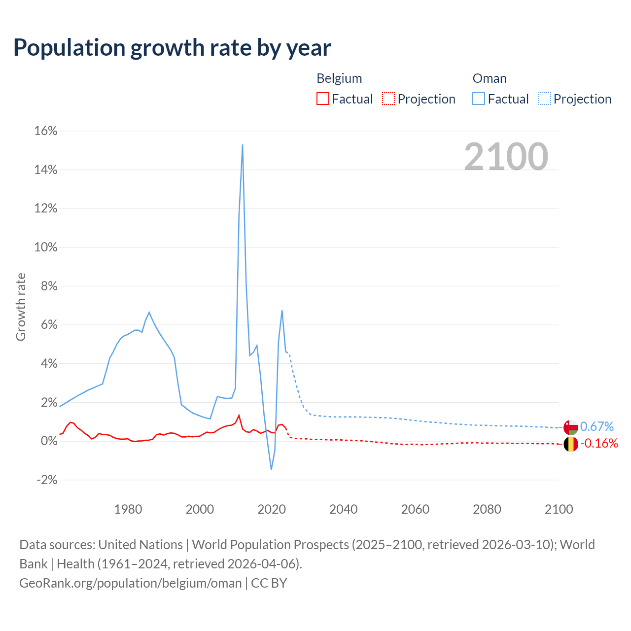 - For the last 10 years, Belgium has had an average growth rate of +0.55% per year vs +2.99% in Oman.