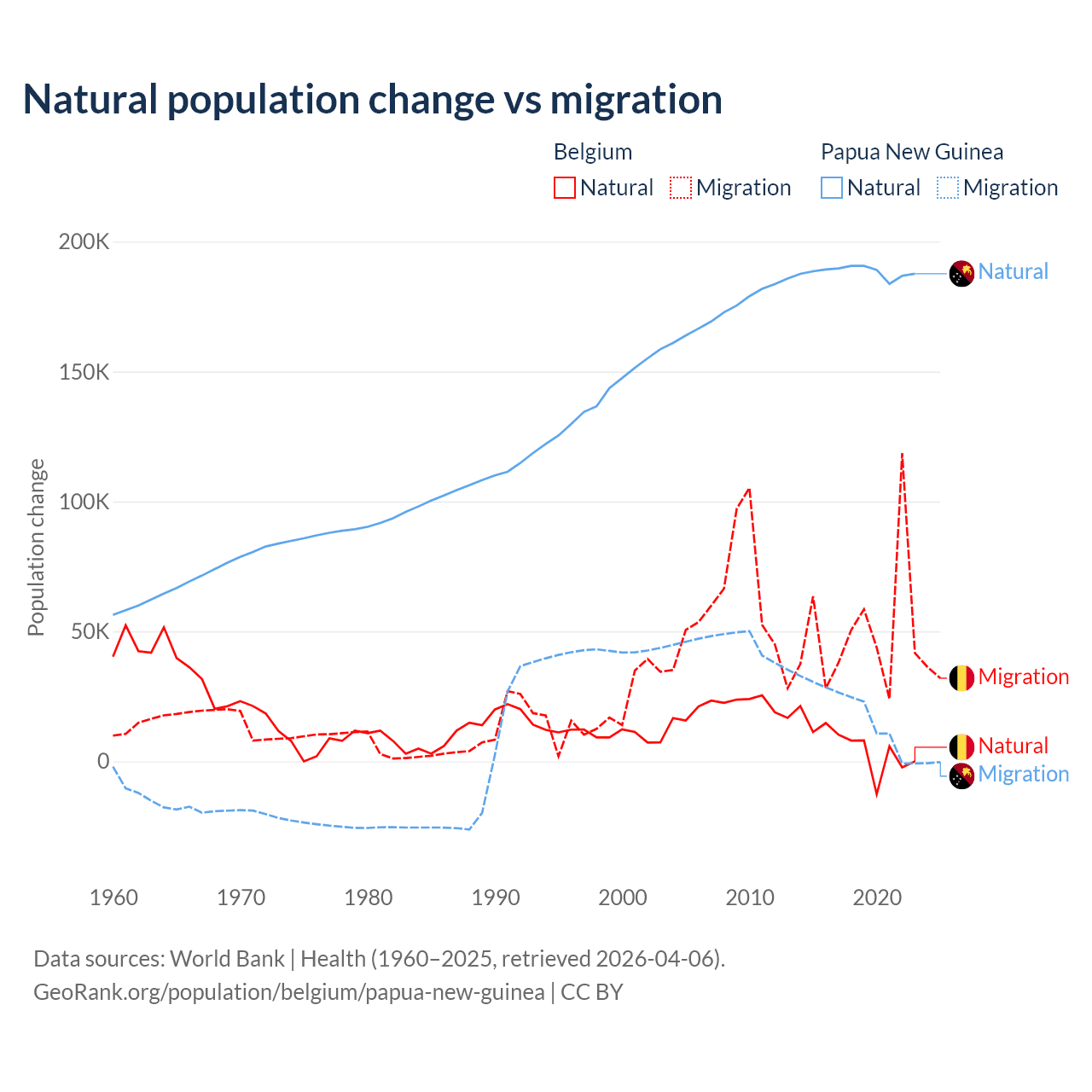 Over the last 10 years, 11.3% of the population change in Belgium is from natural causes (a gain of 64,346 people) and 88.7% is from migration (a gain of 504,240 people). In Papua New Guinea 91% is from natural causes (a gain of 1,883,906 people) and 8.98% is from migration (a gain of 185,900 people).