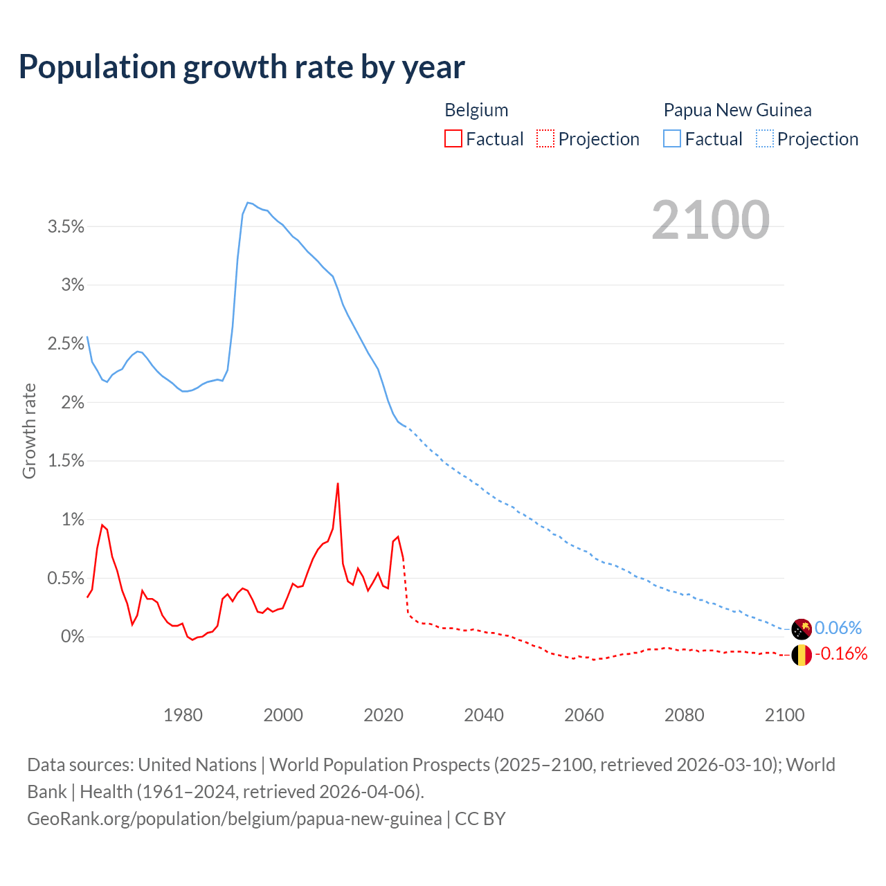 - For the last 10 years, Belgium has had an average growth rate of +0.55% per year vs +2.23% in Papua New Guinea.