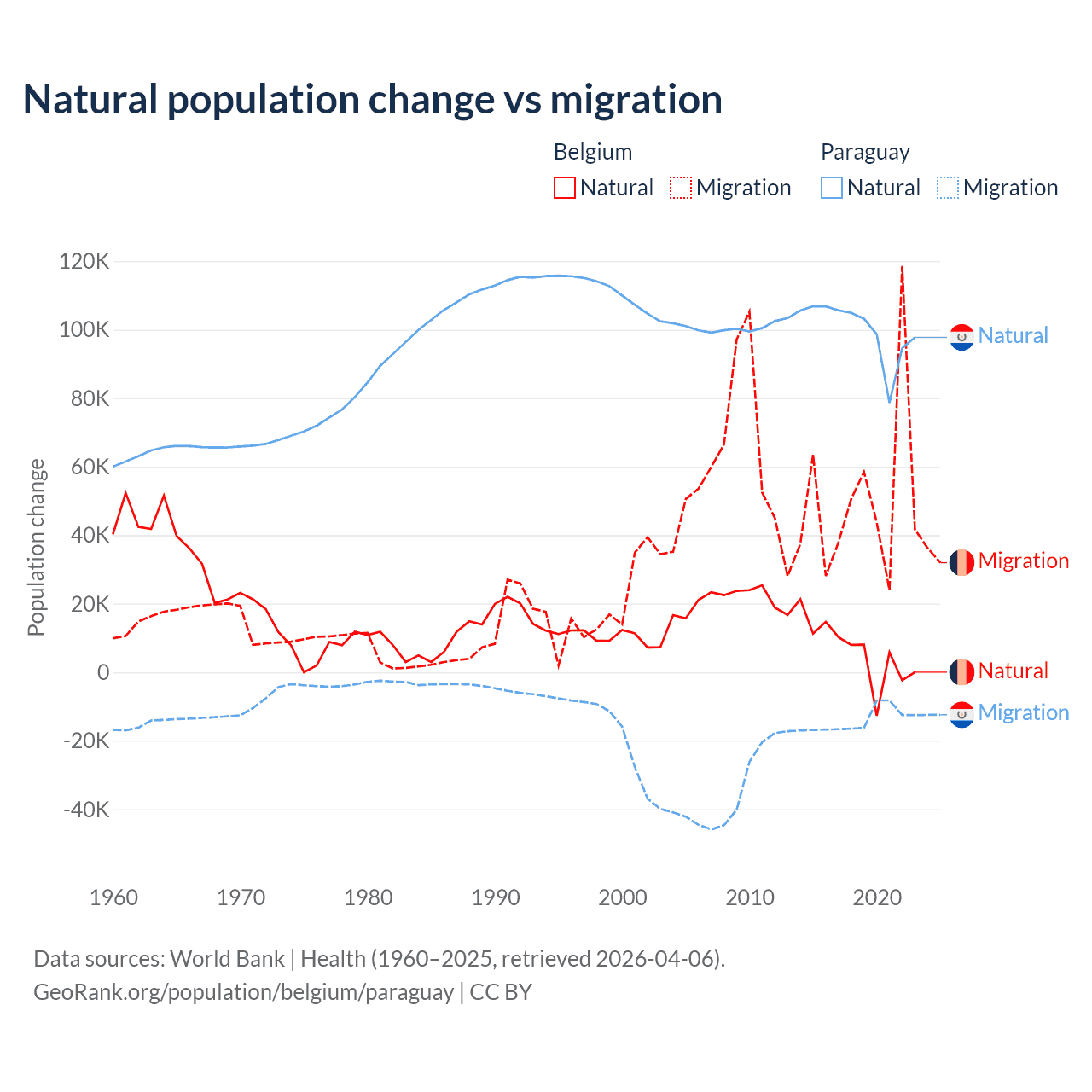 Over the last 10 years, 11.3% of the population change in Belgium is from natural causes (a gain of 64,346 people) and 88.7% is from migration (a gain of 504,240 people). In Paraguay 87.6% is from natural causes (a gain of 1,002,636 people) and 12.4% is from migration (a loss of 141,377 people).