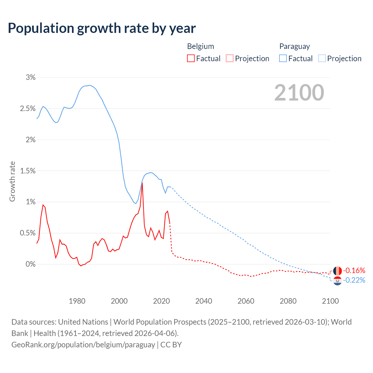 - For the last 10 years, Belgium has had an average growth rate of +0.55% per year vs +1.34% in Paraguay.
