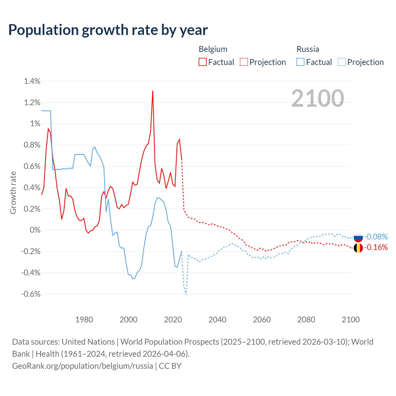 - For the last 10 years, Belgium has had an average growth rate of +0.55% per year vs -0.02% in Russia.