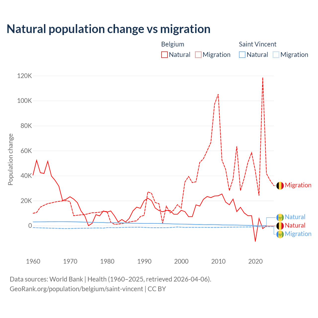 Over the last 10 years, 11.3% of the population change in Belgium is from natural causes (a gain of 64,346 people) and 88.7% is from migration (a gain of 504,240 people). In Saint Vincent 21.2% is from natural causes (a gain of 2,525 people) and 78.8% is from migration (a loss of 9,393 people).
