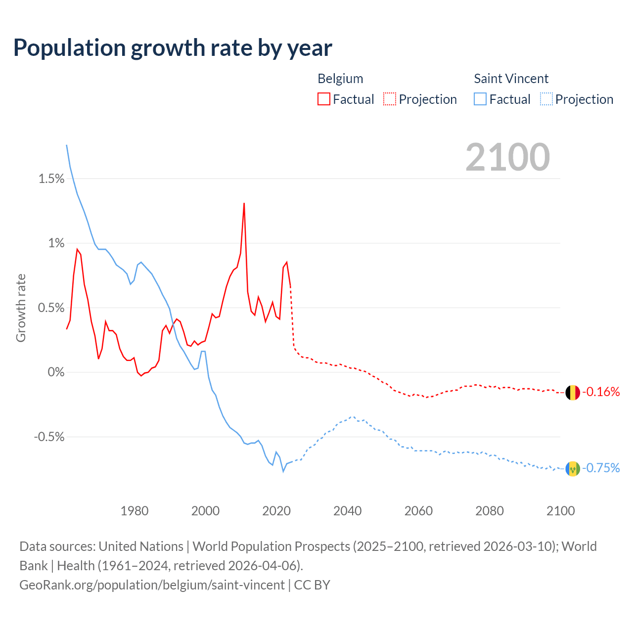 - For the last 10 years, Belgium has had an average growth rate of +0.55% per year vs -0.65% in Saint Vincent.