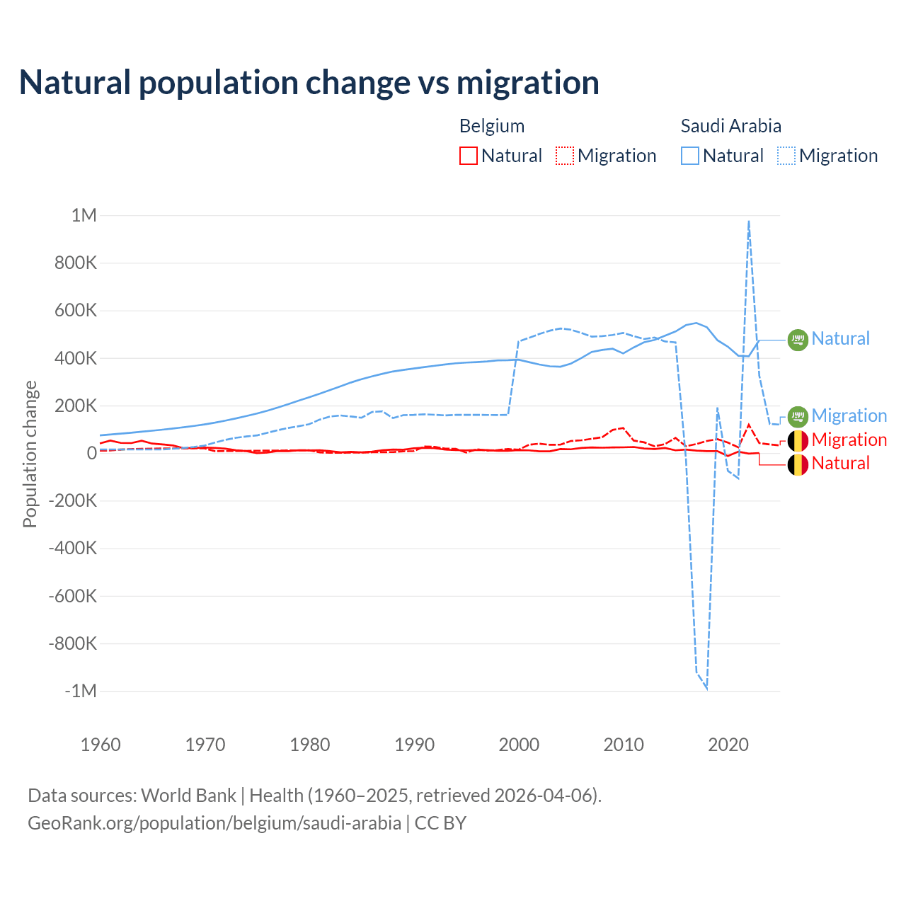 Over the last 10 years, 11.3% of the population change in Belgium is from natural causes (a gain of 64,346 people) and 88.7% is from migration (a gain of 504,240 people). In Saudi Arabia 93.9% is from natural causes (a gain of 4,829,562 people) and 6.05% is from migration (a gain of 311,209 people).
