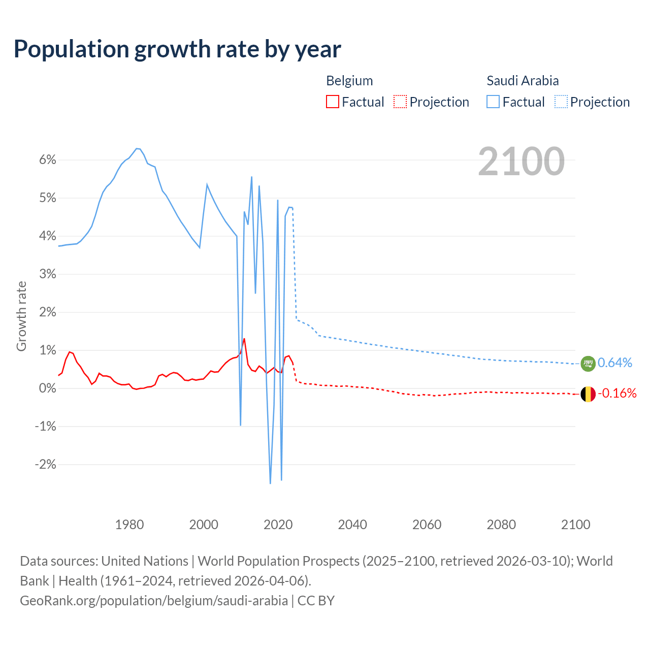 - For the last 10 years, Belgium has had an average growth rate of +0.55% per year vs +2.3% in Saudi Arabia.