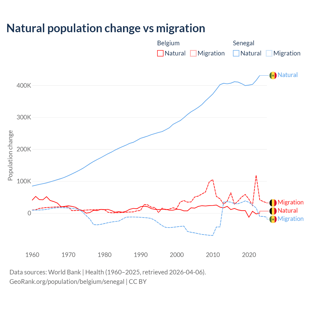 Over the last 10 years, 11.3% of the population change in Belgium is from natural causes (a gain of 64,346 people) and 88.7% is from migration (a gain of 504,240 people). In Senegal 93.9% is from natural causes (a gain of 4,089,205 people) and 6.13% is from migration (a gain of 267,266 people).