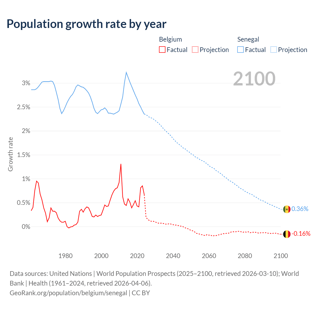 - For the last 10 years, Belgium has had an average growth rate of +0.55% per year vs +2.76% in Senegal.