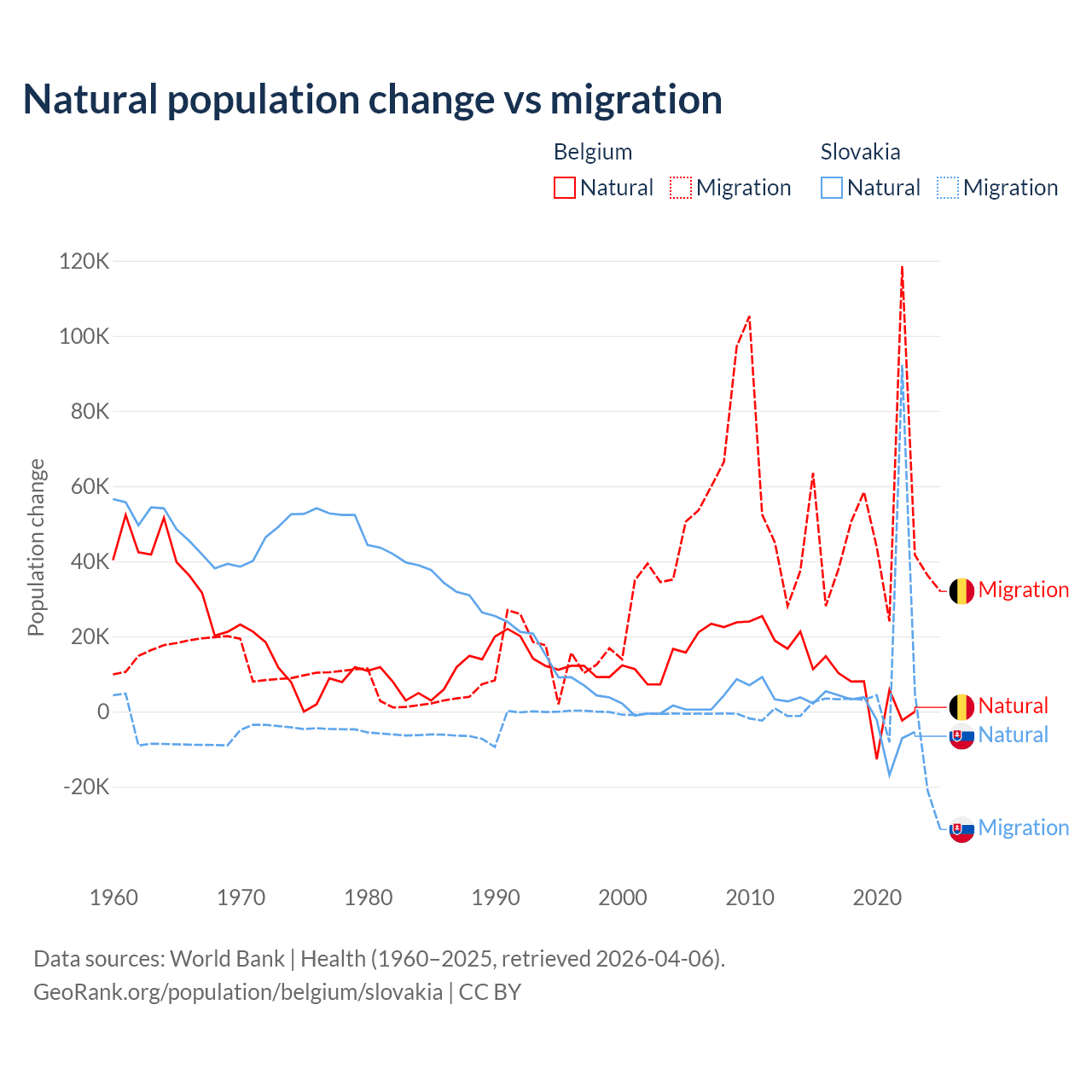 Over the last 10 years, 11.3% of the population change in Belgium is from natural causes (a gain of 64,346 people) and 88.7% is from migration (a gain of 504,240 people). In Slovakia 7.47% is from natural causes (a loss of 8,728 people) and 92.5% is from migration (a gain of 108,156 people).