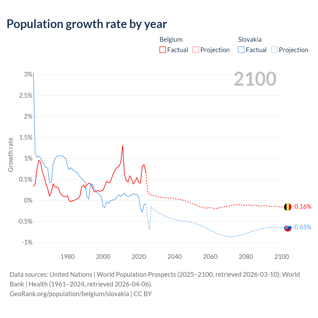 - For the last 10 years, Belgium has had an average growth rate of +0.55% per year vs +0.01% in Slovakia.