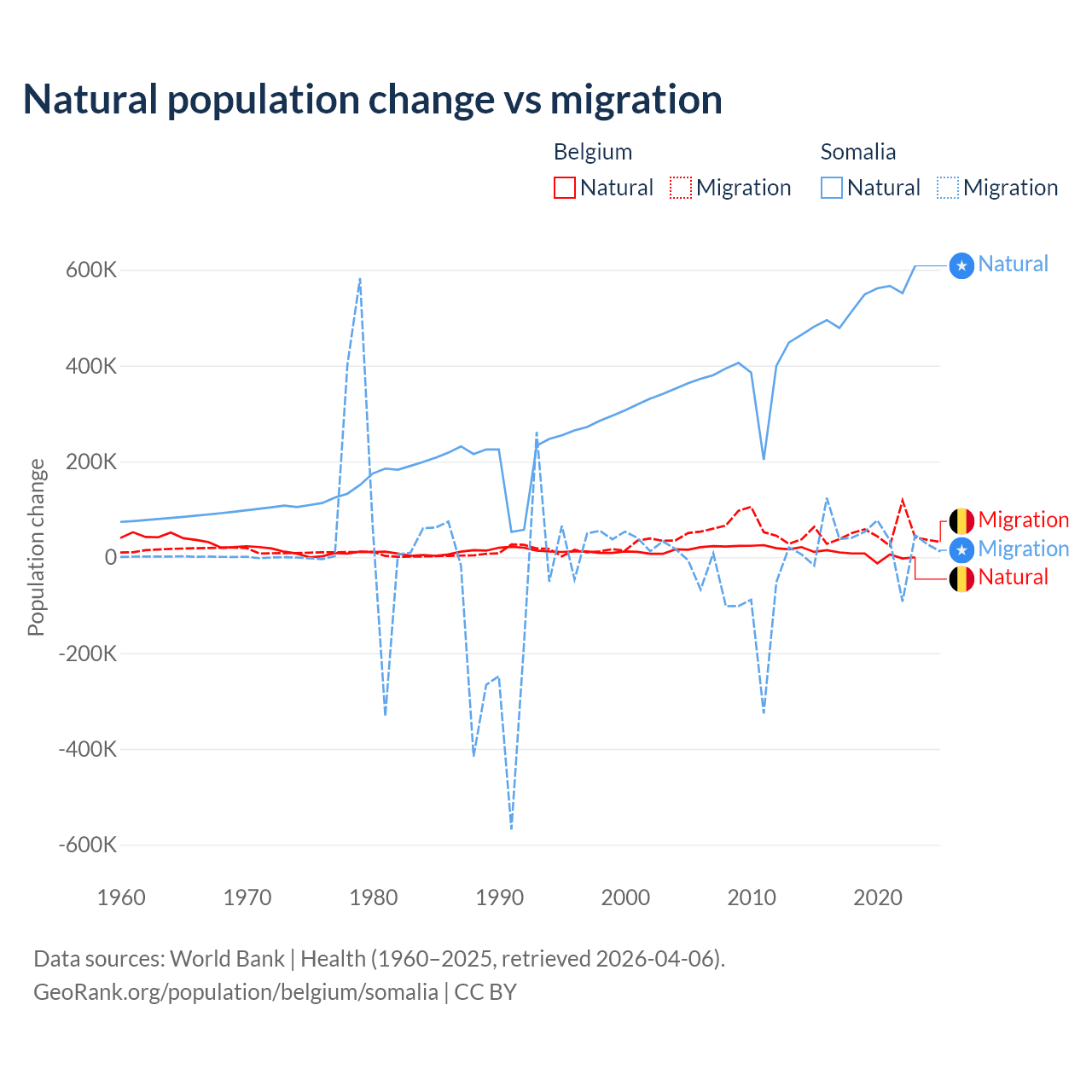 Over the last 10 years, 11.3% of the population change in Belgium is from natural causes (a gain of 64,346 people) and 88.7% is from migration (a gain of 504,240 people). In Somalia 94.4% is from natural causes (a gain of 5,270,105 people) and 5.58% is from migration (a gain of 311,487 people).