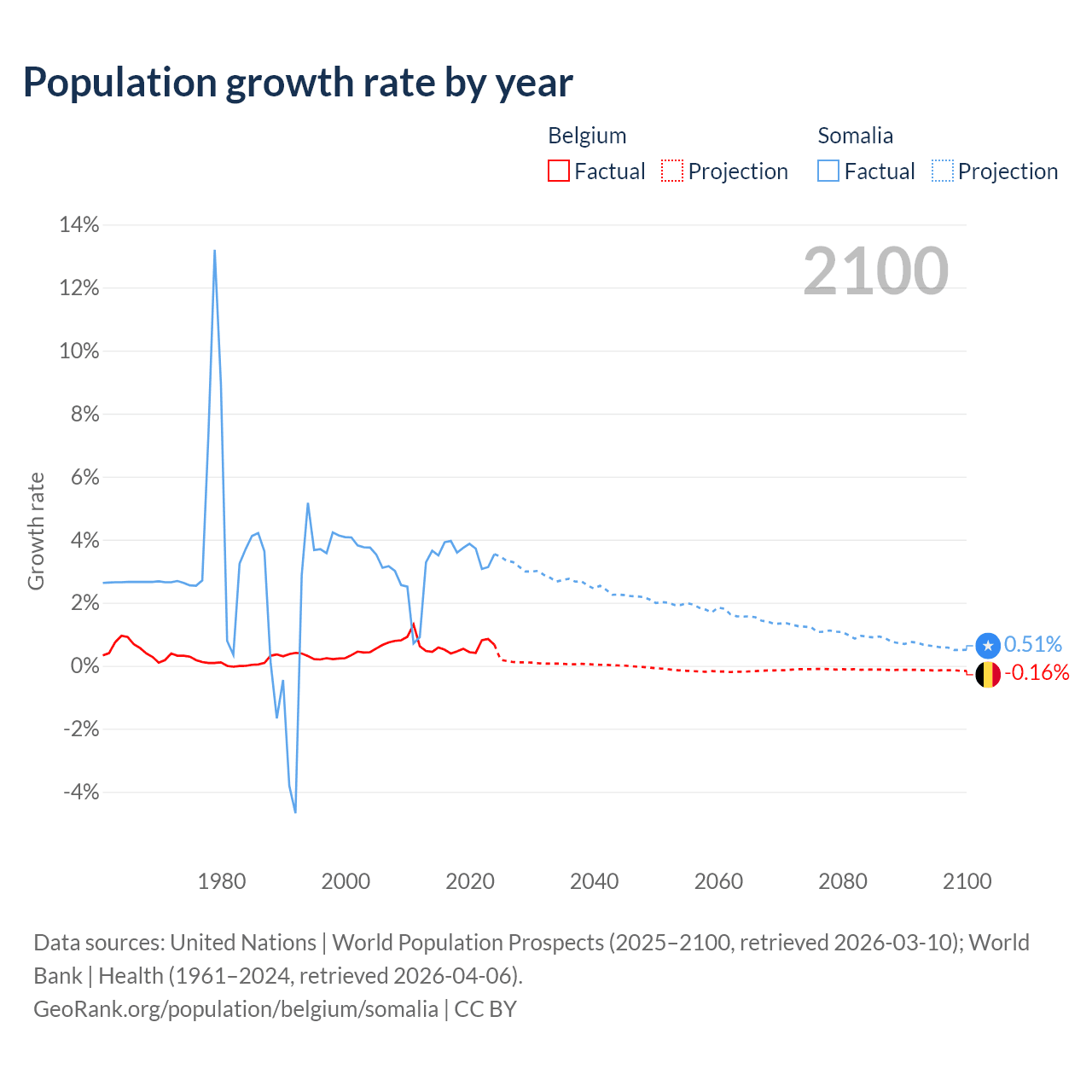 - For the last 10 years, Belgium has had an average growth rate of +0.55% per year vs +3.61% in Somalia.