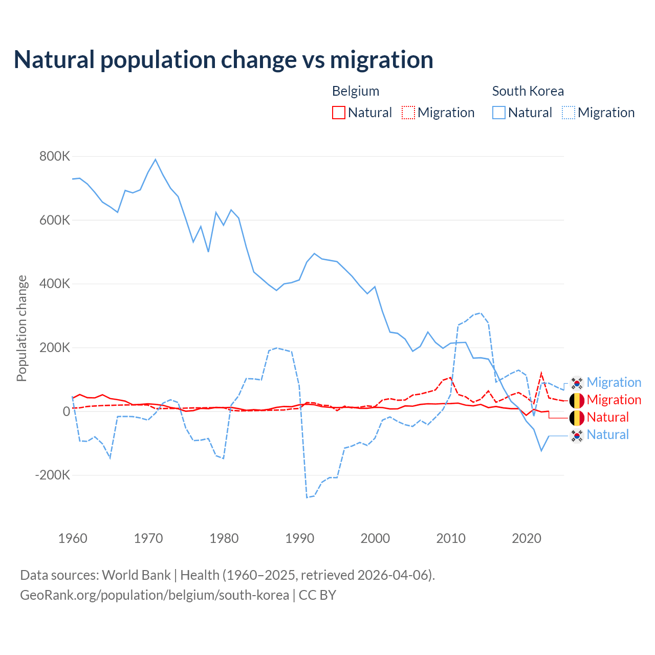 Over the last 10 years, 11.3% of the population change in Belgium is from natural causes (a gain of 64,346 people) and 88.7% is from migration (a gain of 504,240 people). In South Korea 17.6% is from natural causes (a gain of 277,215 people) and 82.4% is from migration (a gain of 1,298,356 people).