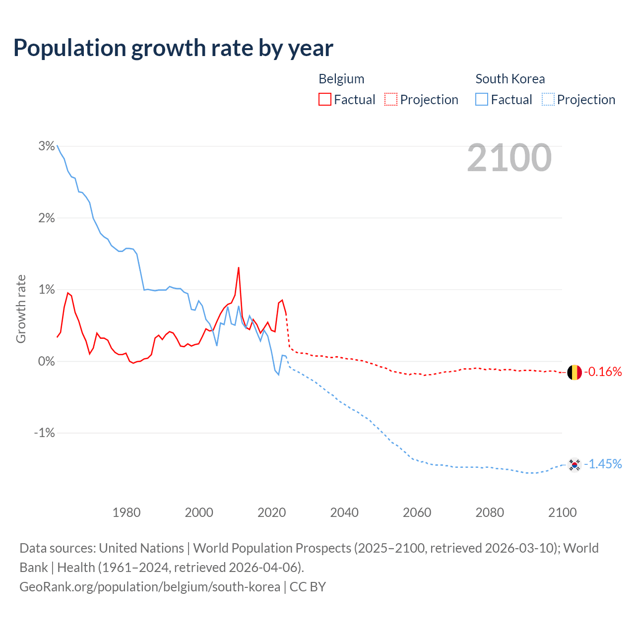 - For the last 10 years, Belgium has had an average growth rate of +0.55% per year vs +0.24% in South Korea.