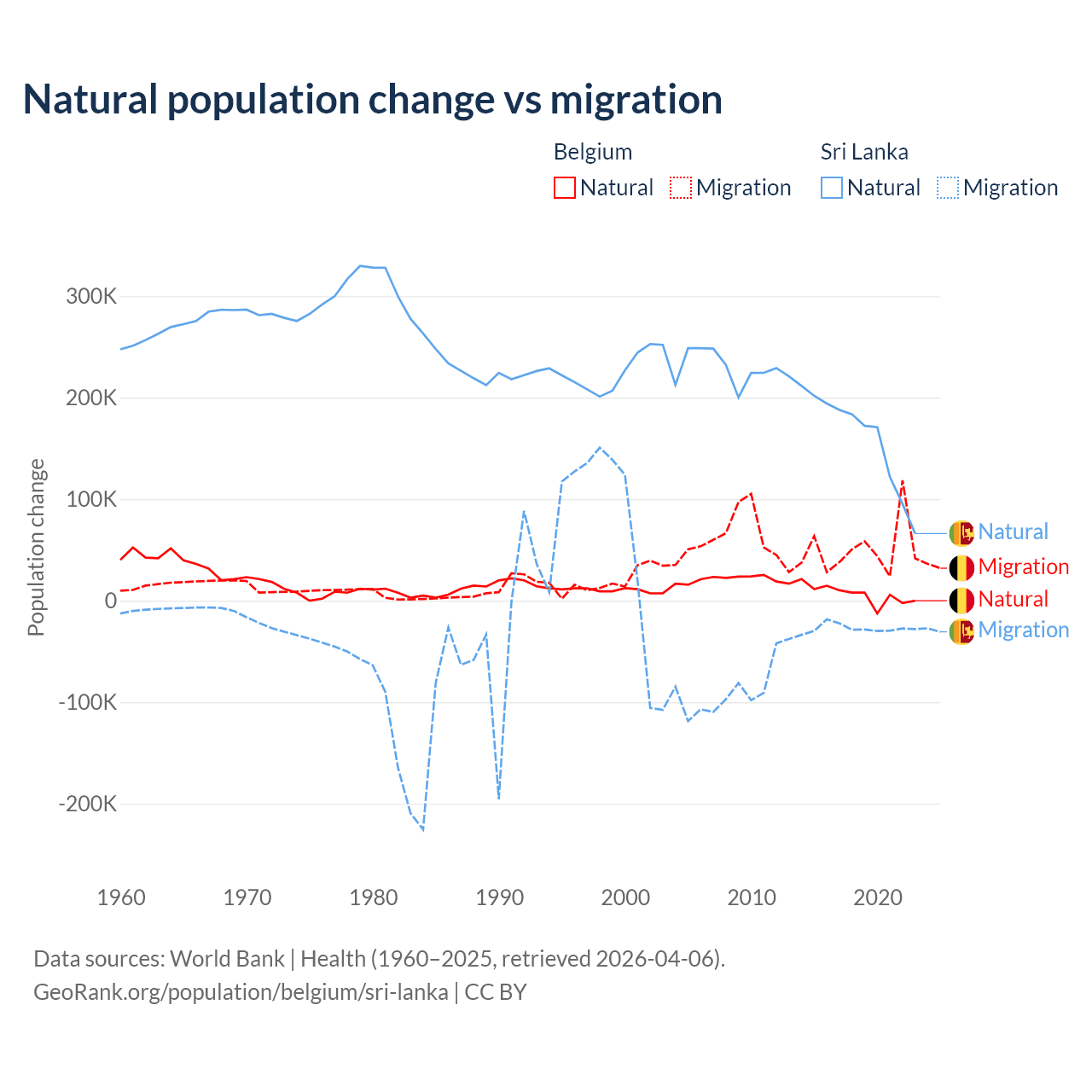 Over the last 10 years, 11.3% of the population change in Belgium is from natural causes (a gain of 64,346 people) and 88.7% is from migration (a gain of 504,240 people). In Sri Lanka 85.3% is from natural causes (a gain of 1,605,749 people) and 14.7% is from migration (a loss of 276,121 people).