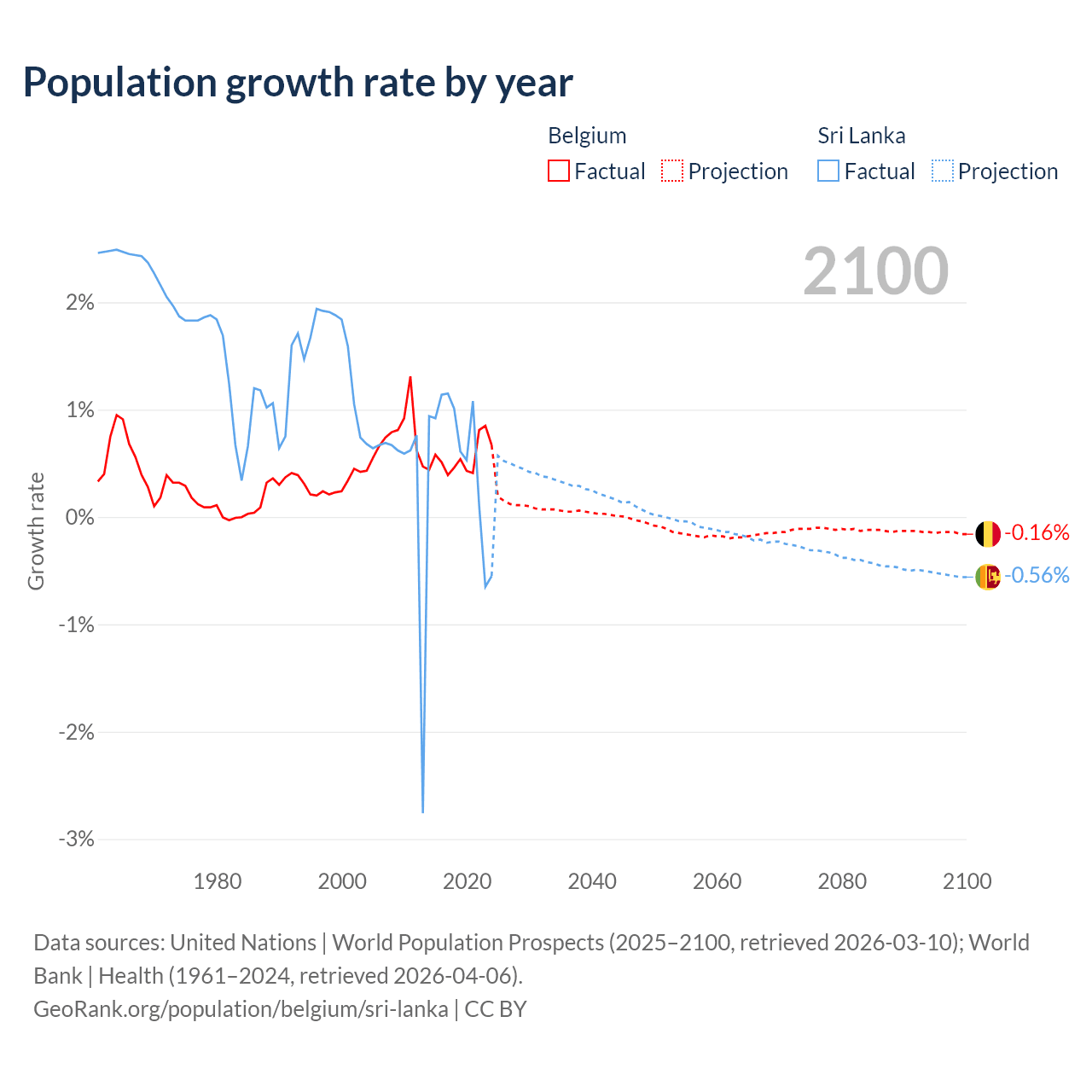 - For the last 10 years, Belgium has had an average growth rate of +0.55% per year vs +0.57% in Sri Lanka.