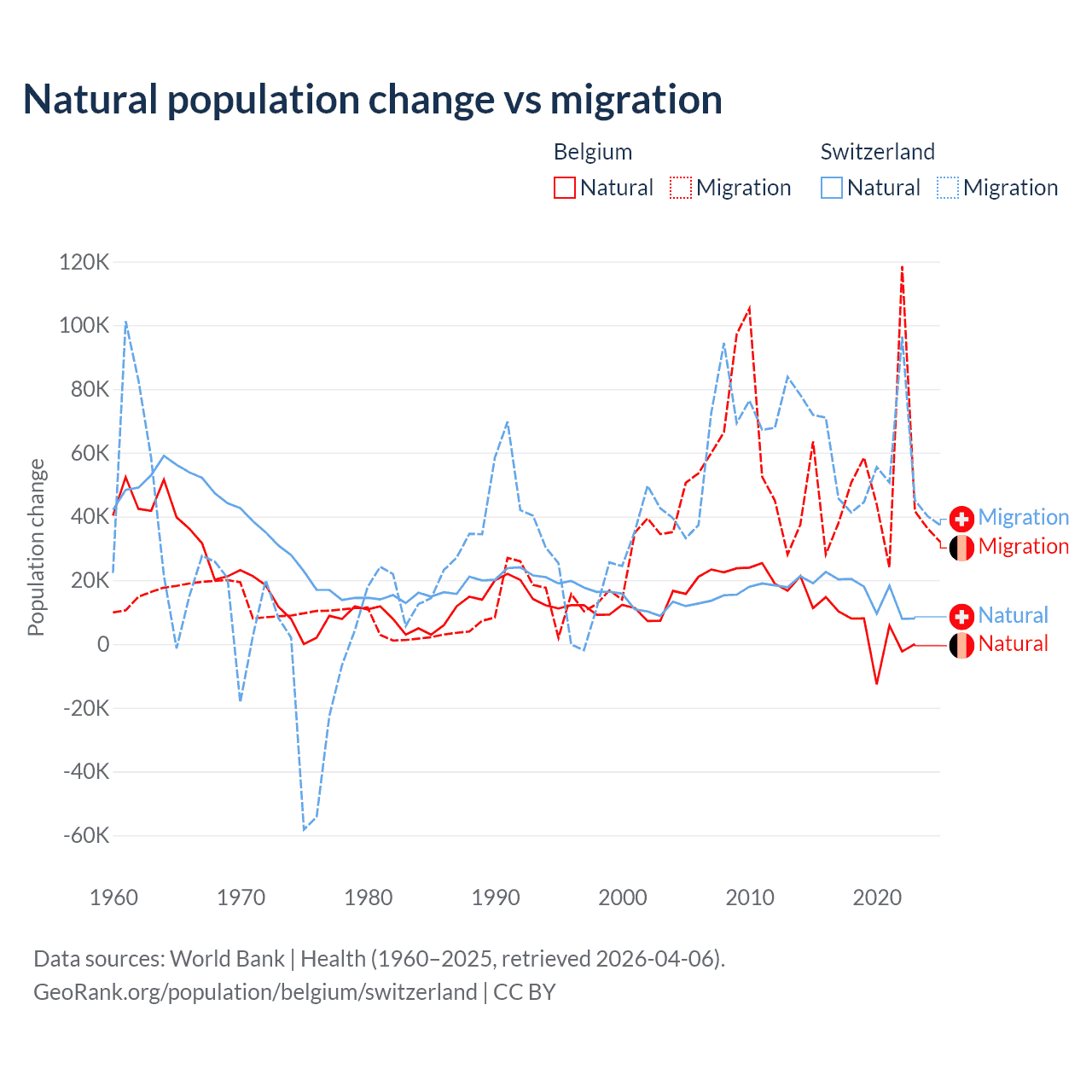 Over the last 10 years, 11.3% of the population change in Belgium is from natural causes (a gain of 64,346 people) and 88.7% is from migration (a gain of 504,240 people). In Switzerland 21.6% is from natural causes (a gain of 165,354 people) and 78.4% is from migration (a gain of 600,145 people).