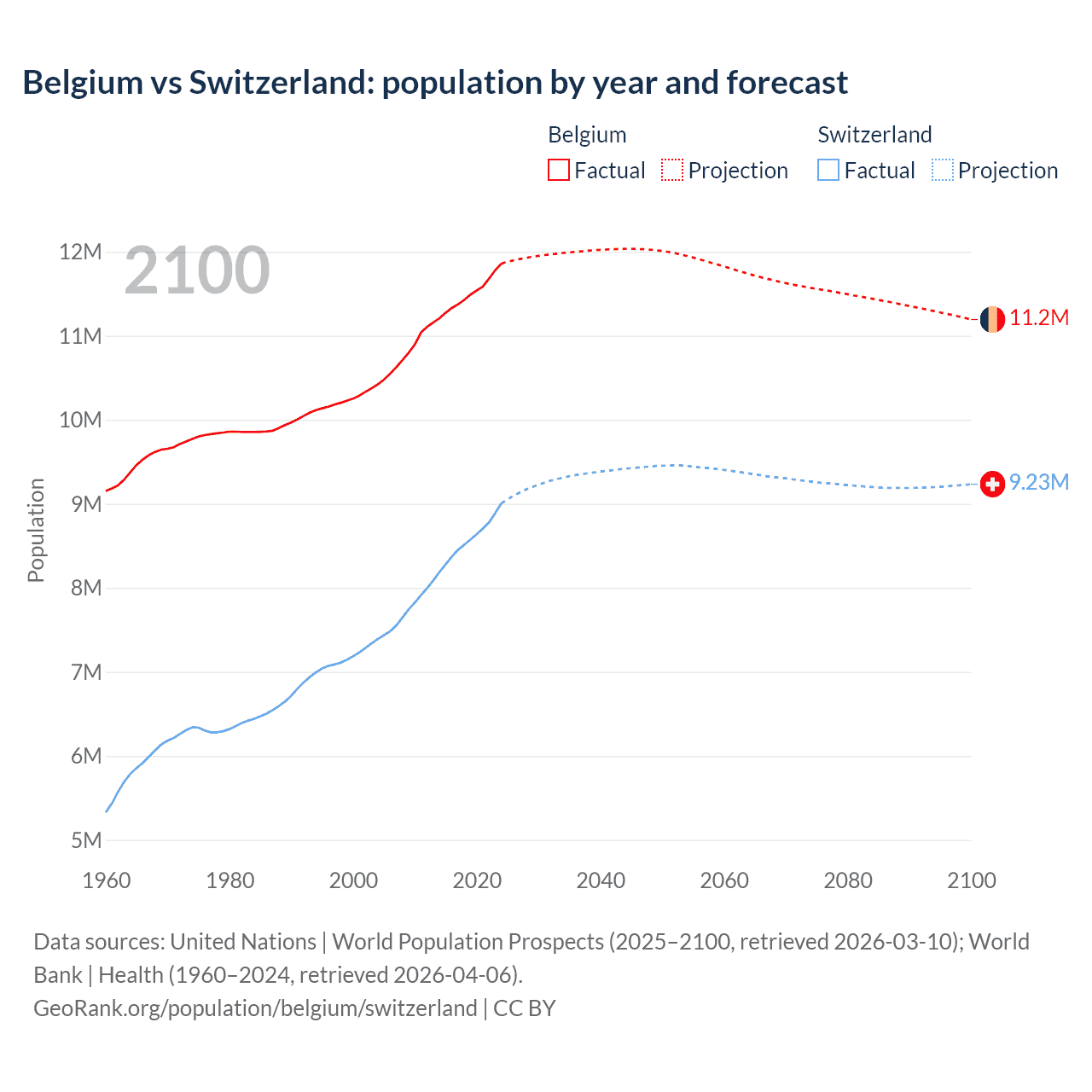 The latest officially reported population of Belgium was 11,858,610 in 2024 vs 9,005,582 people in Switzerland in 2024. In 2026, based on the adjusted UN estimation, the current Belgium's population is 11,902,714 people compared to 9,107,866 in Switzerland.