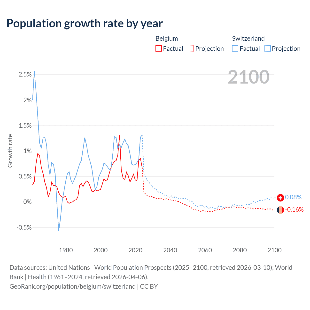- For the last 10 years, Belgium has had an average growth rate of +0.55% per year vs +0.98% in Switzerland.