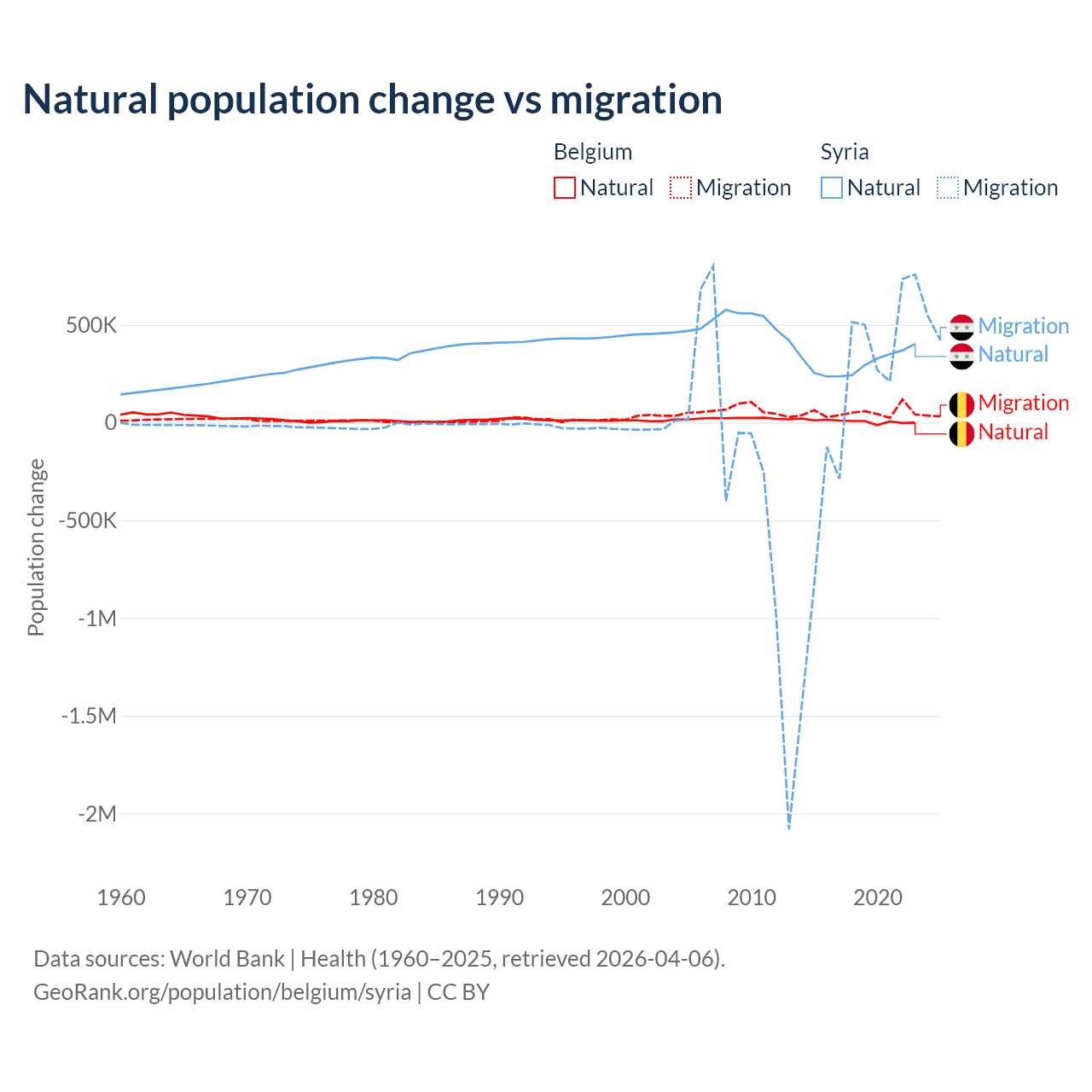 Over the last 10 years, 11.3% of the population change in Belgium is from natural causes (a gain of 64,346 people) and 88.7% is from migration (a gain of 504,240 people). In Syria 91.3% is from natural causes (a gain of 3,047,621 people) and 8.72% is from migration (a gain of 291,069 people).