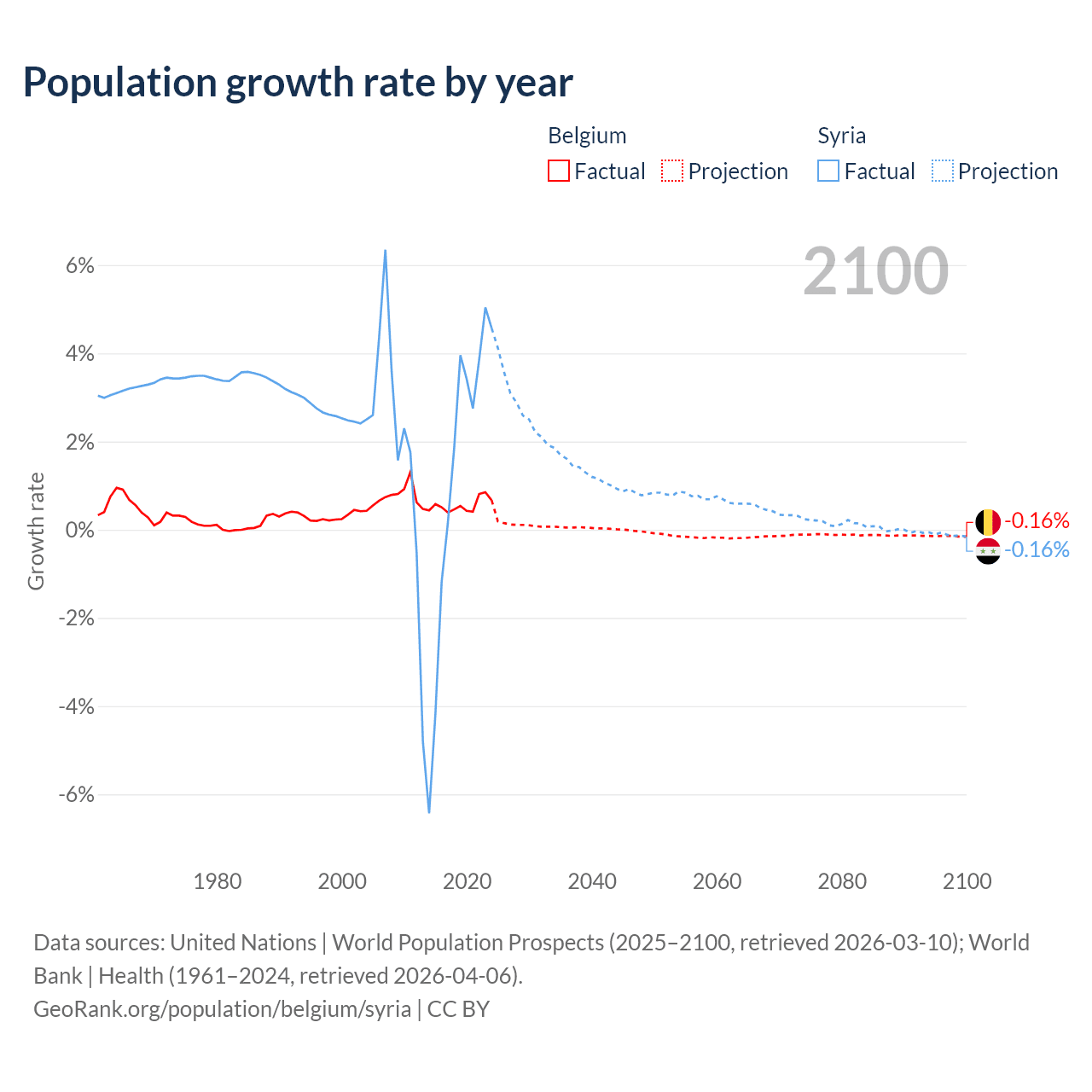 - For the last 10 years, Belgium has had an average growth rate of +0.55% per year vs +1.25% in Syria.