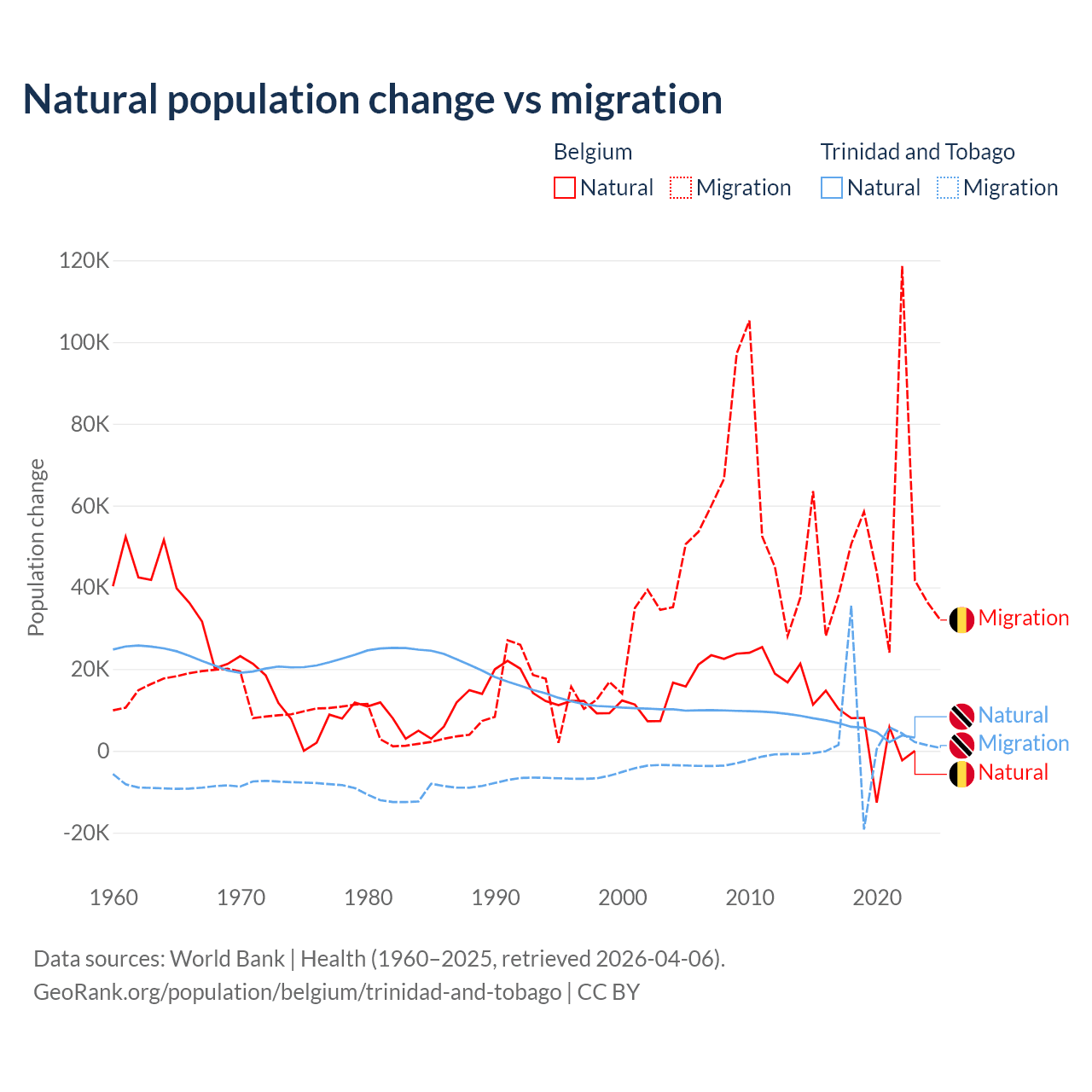 Over the last 10 years, 11.3% of the population change in Belgium is from natural causes (a gain of 64,346 people) and 88.7% is from migration (a gain of 504,240 people). In Trinidad and Tobago 66% is from natural causes (a gain of 55,887 people) and 34% is from migration (a gain of 28,785 people).