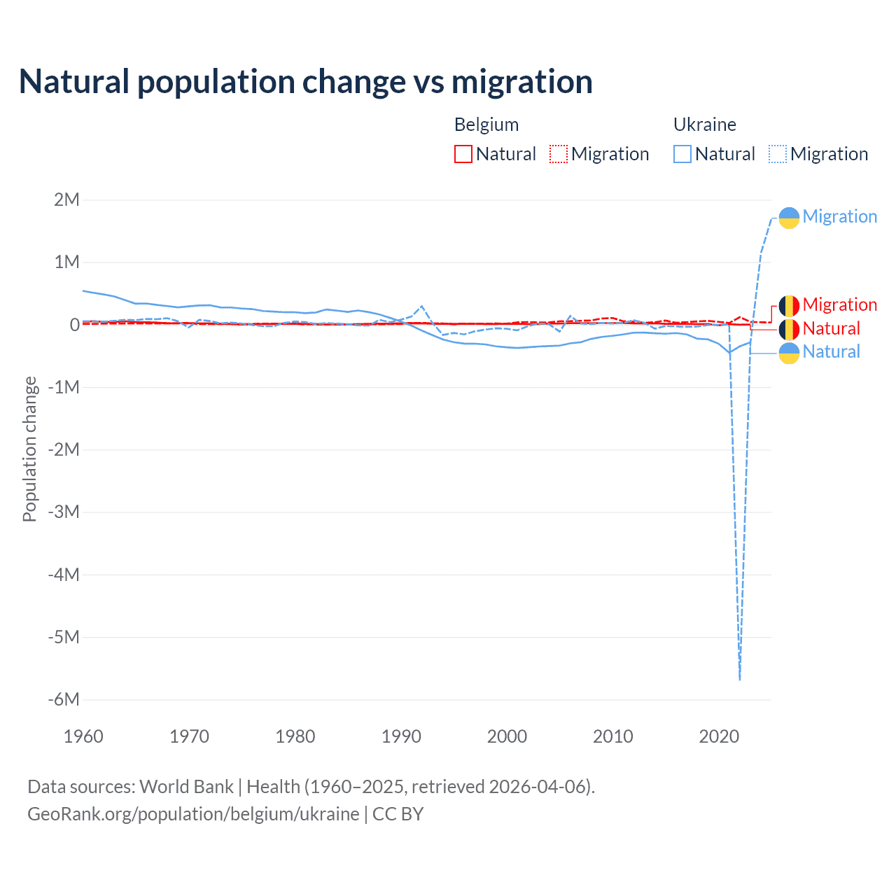 Over the last 10 years, 11.3% of the population change in Belgium is from natural causes (a gain of 64,346 people) and 88.7% is from migration (a gain of 504,240 people). In Ukraine 28.2% is from natural causes (a loss of 2,435,153 people) and 71.8% is from migration (a loss of 6,198,995 people).