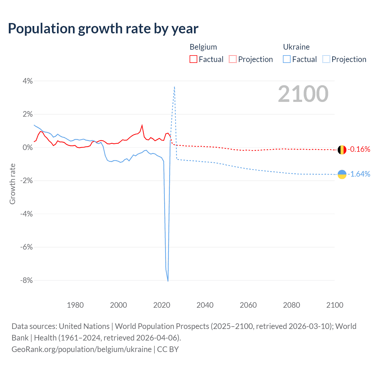 - For the last 10 years, Belgium has had an average growth rate of +0.55% per year vs -1.74% in Ukraine.