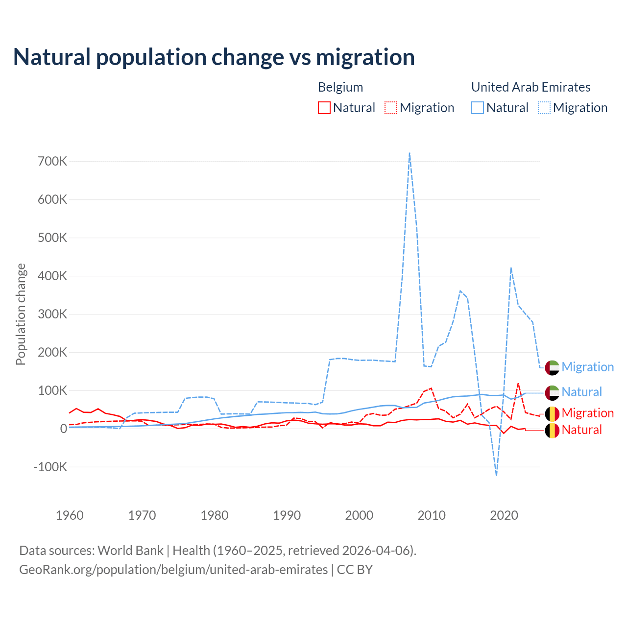 Over the last 10 years, 11.3% of the population change in Belgium is from natural causes (a gain of 64,346 people) and 88.7% is from migration (a gain of 504,240 people). In the United Arab Emirates 30.5% is from natural causes (a gain of 857,996 people) and 69.5% is from migration (a gain of 1,958,520 people).