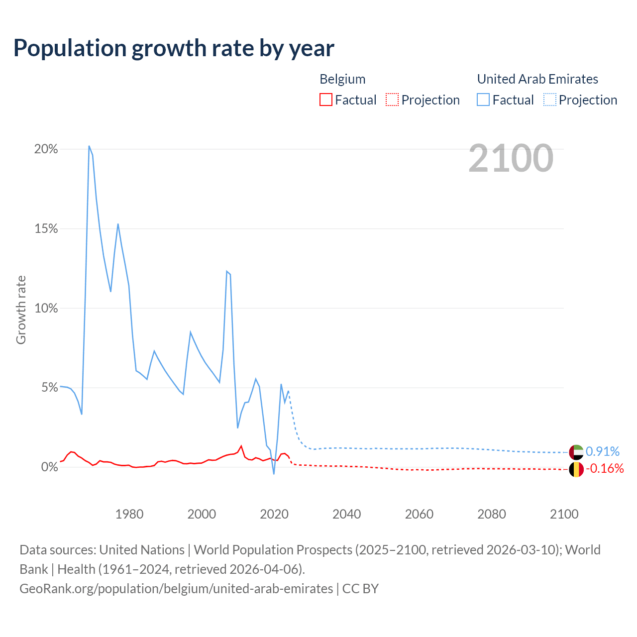 - For the last 10 years, Belgium has had an average growth rate of +0.55% per year vs +3.31% in the United Arab Emirates.
