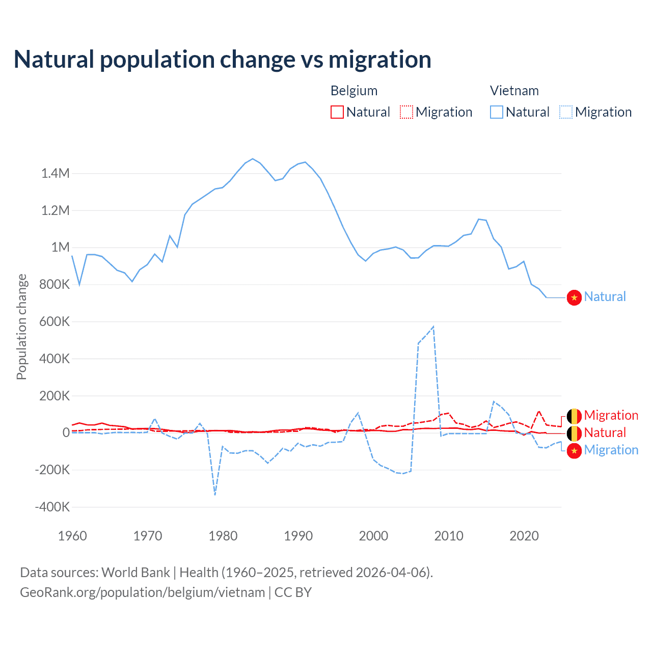 Over the last 10 years, 11.3% of the population change in Belgium is from natural causes (a gain of 64,346 people) and 88.7% is from migration (a gain of 504,240 people). In Vietnam 97.7% is from natural causes (a gain of 9,349,756 people) and 2.29% is from migration (a gain of 219,073 people).