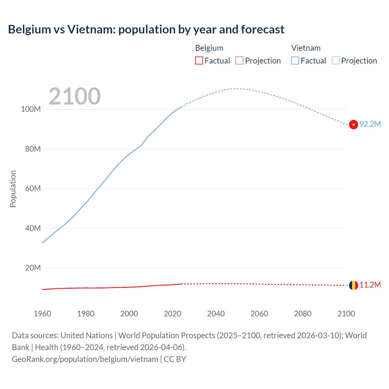 The latest officially reported population of Belgium was 11,858,610 in 2024 vs 100,987,686 people in Vietnam in 2024. In 2026, based on the adjusted UN estimation, the current Belgium's population is 11,902,714 people compared to 102,365,351 in Vietnam.