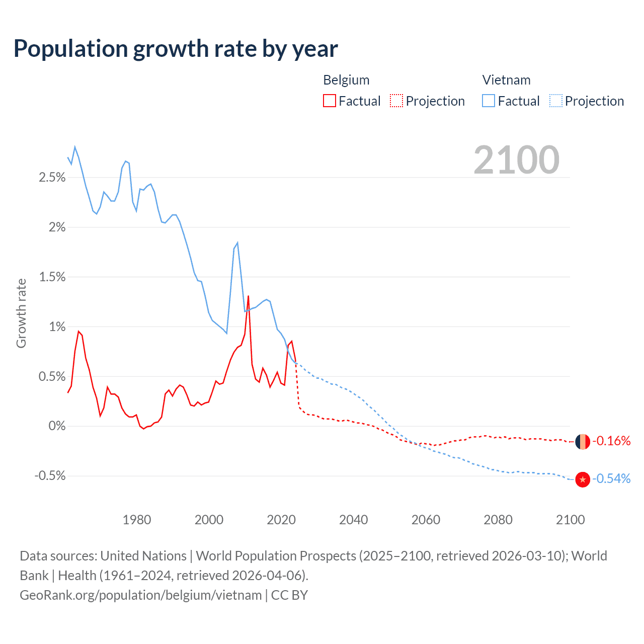- For the last 10 years, Belgium has had an average growth rate of +0.55% per year vs +0.99% in Vietnam.