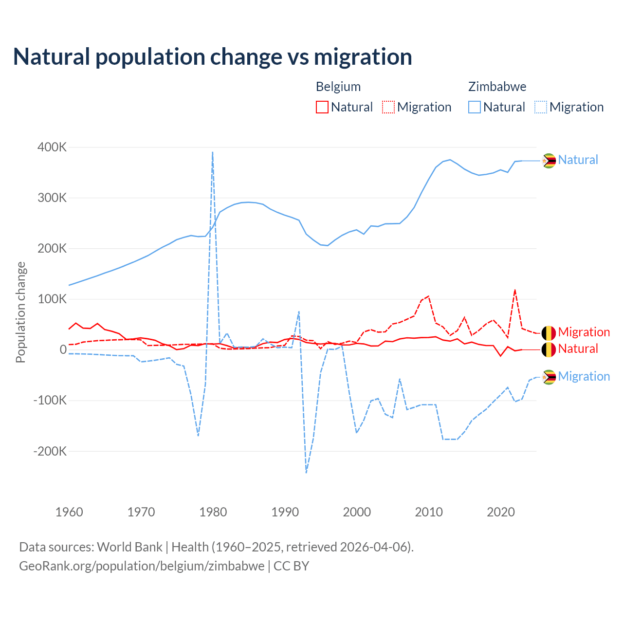 Over the last 10 years, 11.3% of the population change in Belgium is from natural causes (a gain of 64,346 people) and 88.7% is from migration (a gain of 504,240 people). In Zimbabwe 74.9% is from natural causes (a gain of 3,558,487 people) and 25.1% is from migration (a loss of 1,192,807 people).