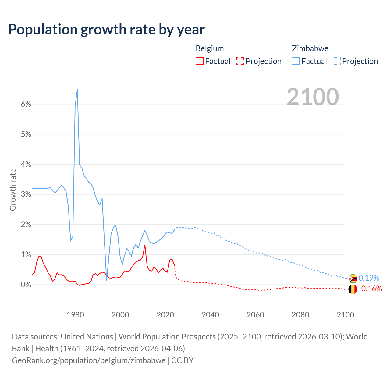 - For the last 10 years, Belgium has had an average growth rate of +0.55% per year vs +1.57% in Zimbabwe.